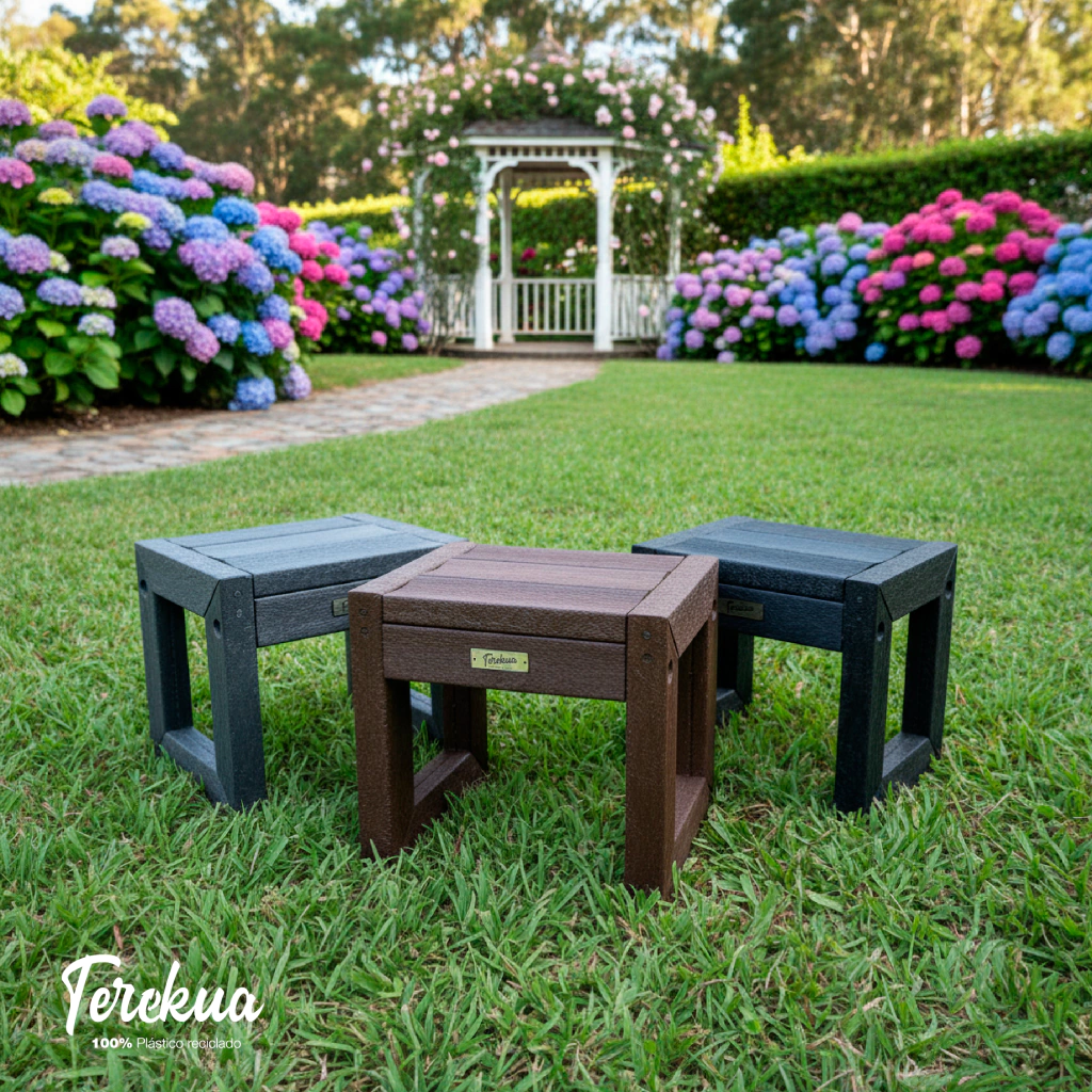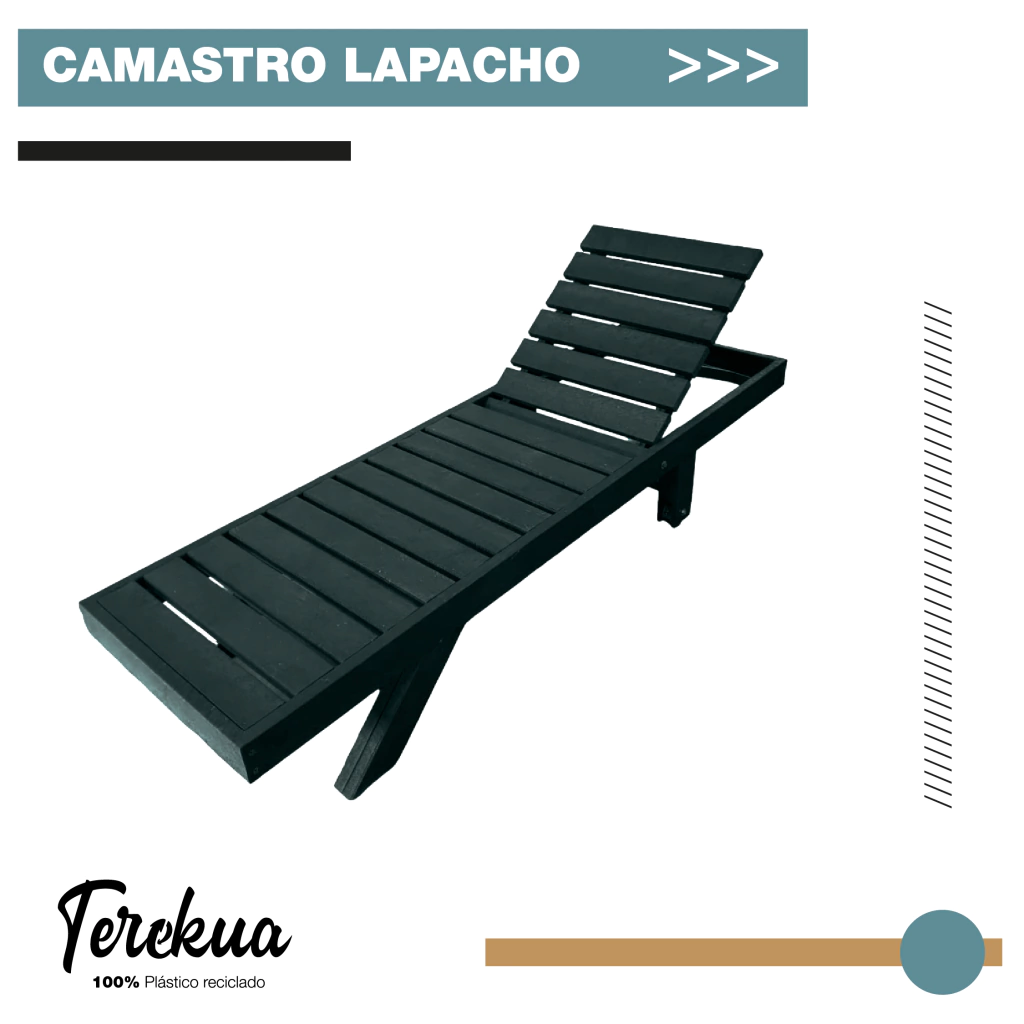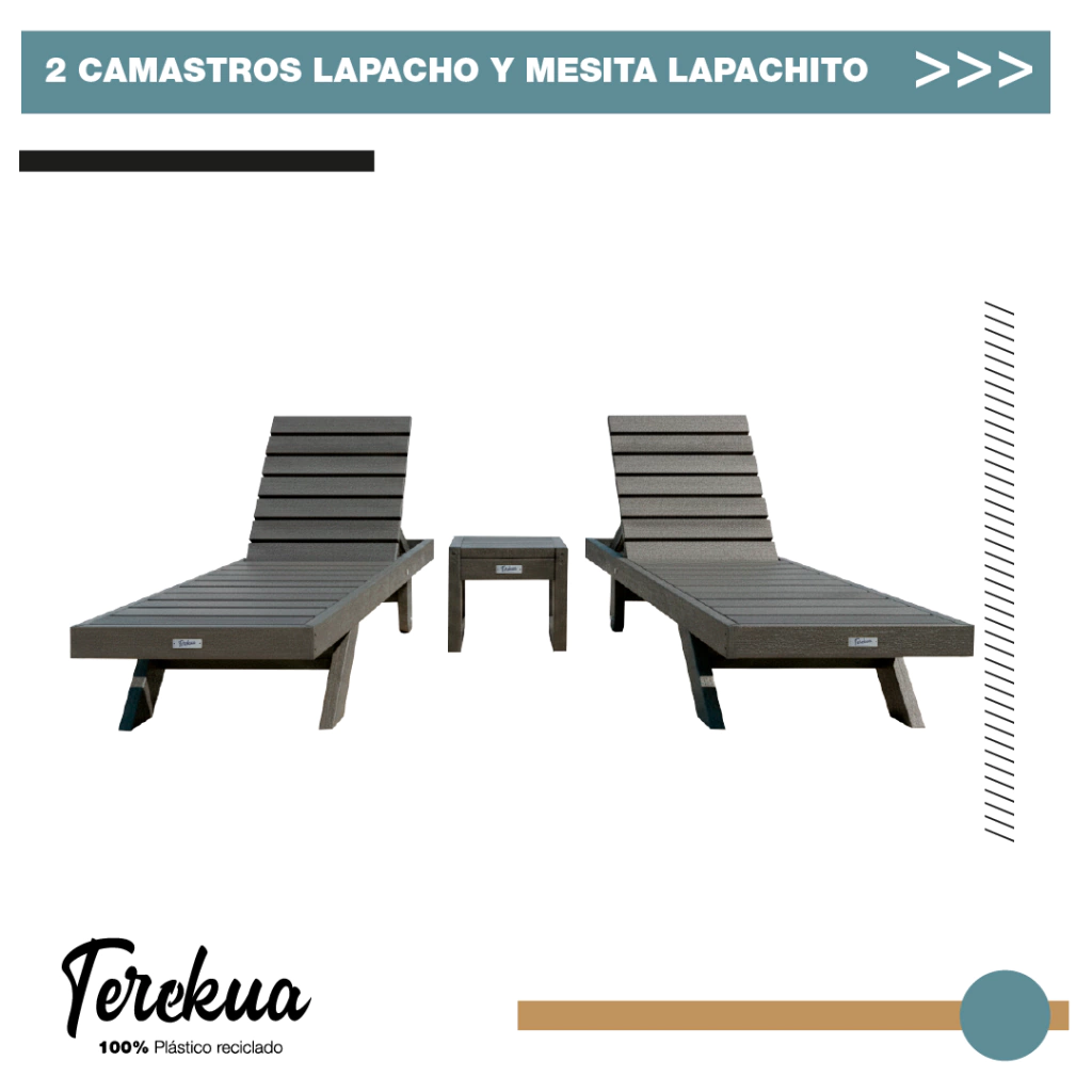 El Combo Lapacho incluye 2 Camastros Lapacho + 1 Mesita/Banco Lapachito, todos fabricados 100% con plástico reciclado, evitando la tala de árboles y contribuyendo a un consumo responsable.