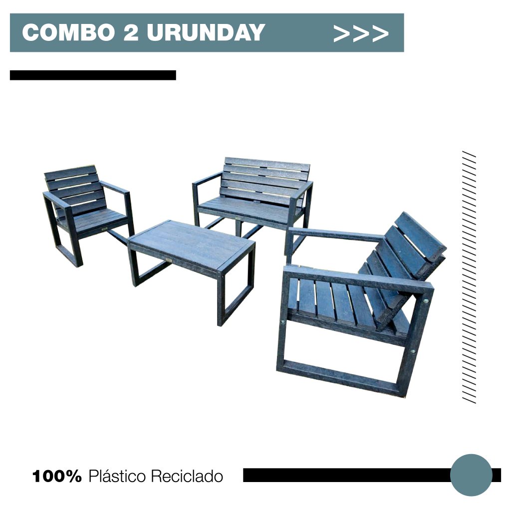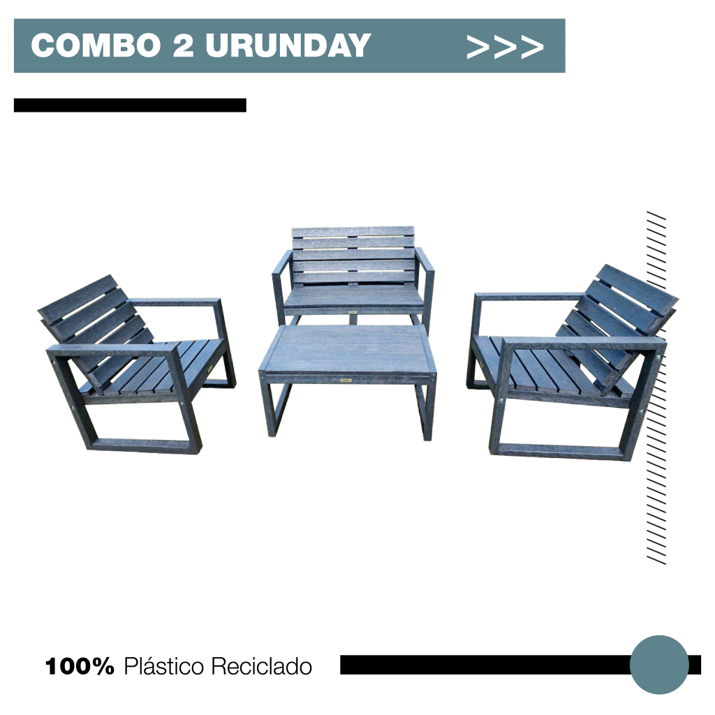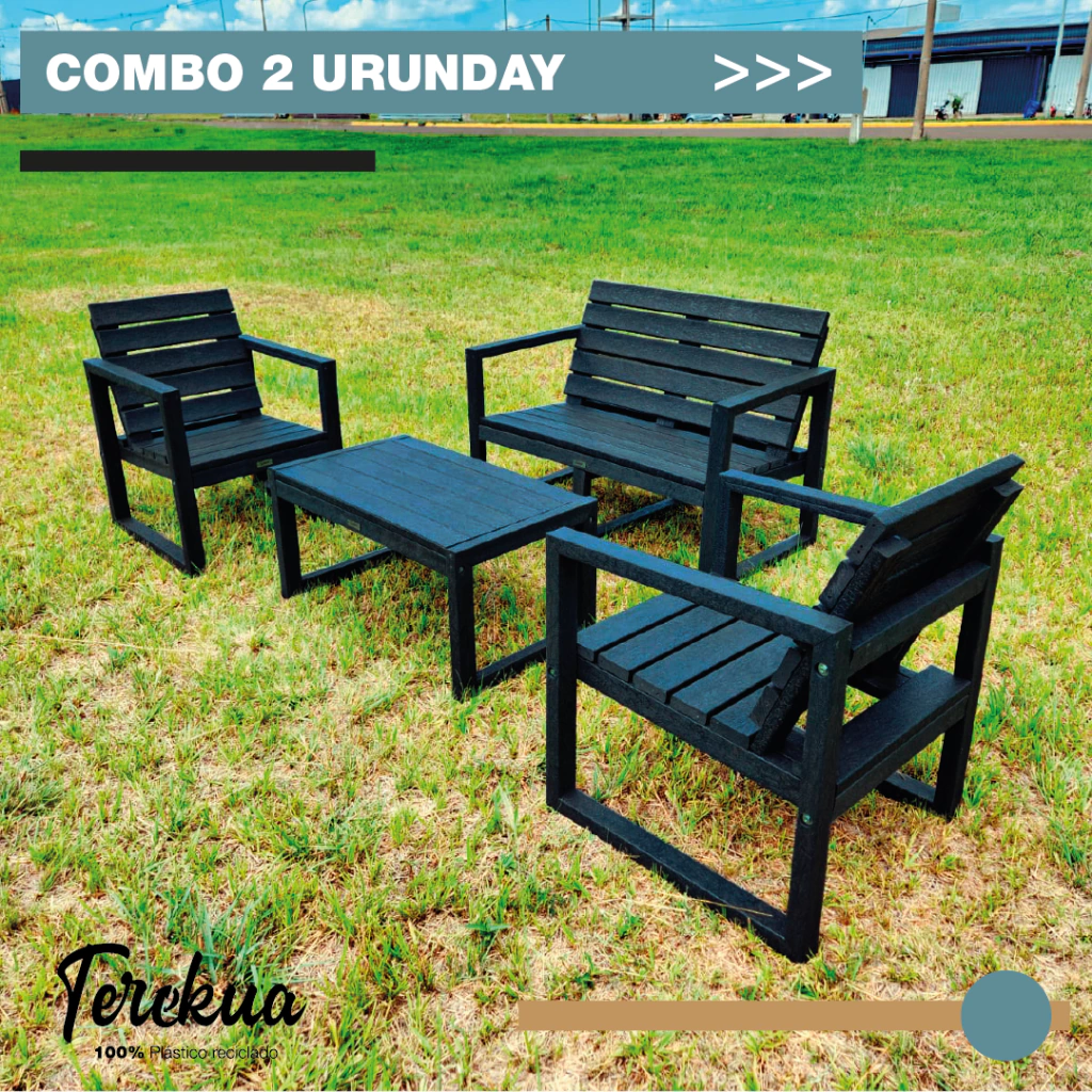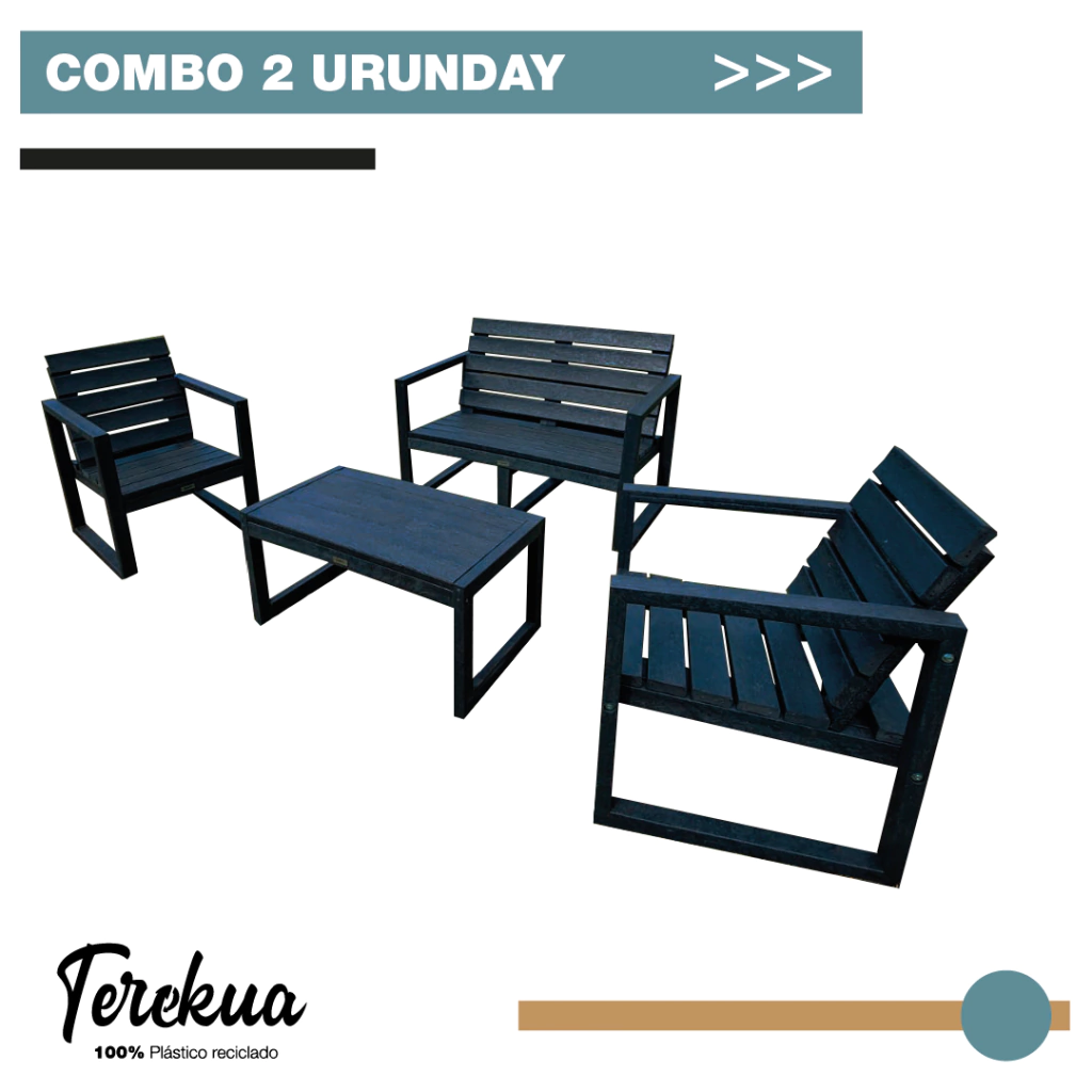 Eleva el estilo y la sostenibilidad de tu espacio con el Combo 2 Urunday. Este conjunto incluye dos sillones Urunday de 1 cuerpo, un sillón Urunday de 2 cuerpos, y una mesa ratona Urunday. Todos los productos están elaborados al 100% con plástico reciclado, rindiendo homenaje al majestuoso árbol Urunday de Misiones. Perfecto para cualquier ambiente, este combo ofrece durabilidad, estilo y un fuerte compromiso con el medio ambiente.